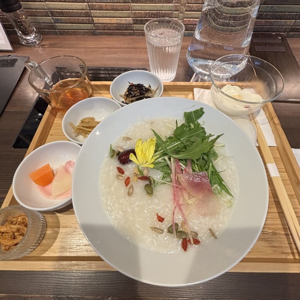 ランチメニューがいくつもある中から選んだのは『薬膳養生粥』。当帰・高麗人参が使われているお粥と、小鉢3種と、デザートと中国茶のセットです。