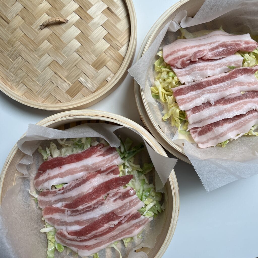 水で溶いたお好み焼き粉とキャベツ、卵を混ぜて、クッキングシートを敷いたせいろに流し込み、豚肉をのせていきます。