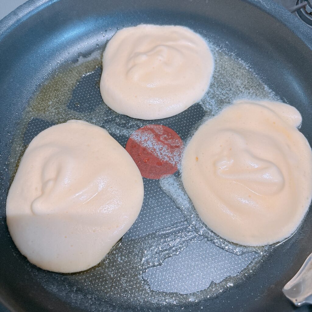 生地は柔らかくて広がりやすいので、隣の生地にくっつかないように流し込む。蓋をして弱火でじっくり4.5分。