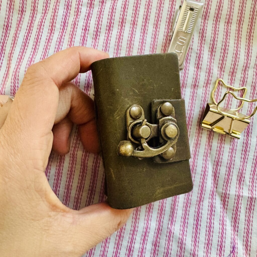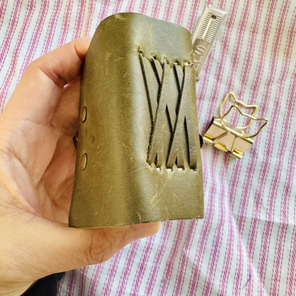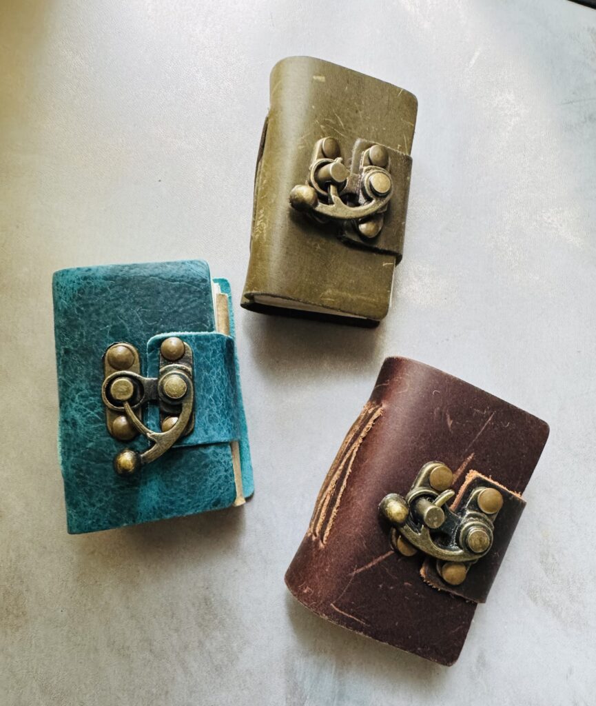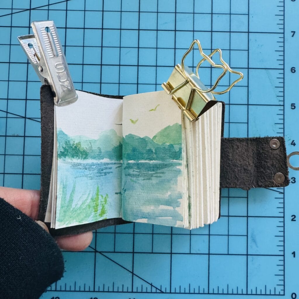 使い込むうちに味が出そうななめし革。紙は水彩画に良さそうな感じ。分冊状のスケッチブックを革紐で留めてあります。