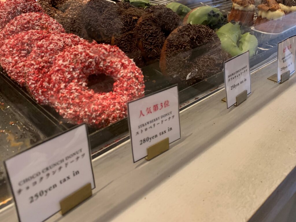 店内に入るとショーケースには様々なフレーバーのドーナツが並んでいます。スタンダードなプレーンやシュガーに加え、ストロベリー、チョコ、抹茶などどれも見た目からおいしそう。ドーナツは帰ってから娘と一緒に食べようと思い、テイクアウトすることに。価格はフレーバーによって異なり200円から購入できます。