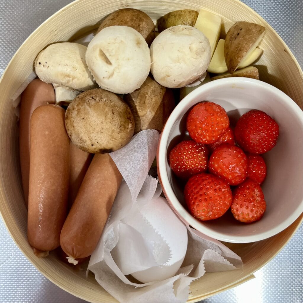 一段目にマッシュルームやウインナーをつめつめ。