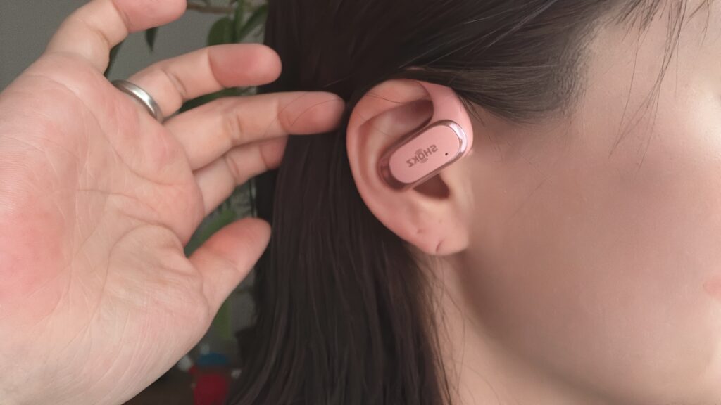 本当に軽くて、つけているのを忘れるくらい自然。イヤホンって、長時間つけていると耳が痛くなったり、圧迫感を感じたりしがちですが、Shokzはそれがまったくないんです。耳の中に入れないから、むしろ“着ける”というより“添える”に近い感覚かもしれません。