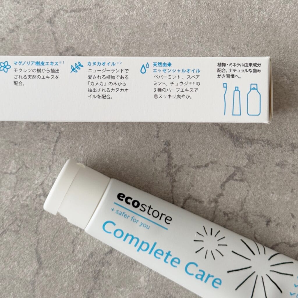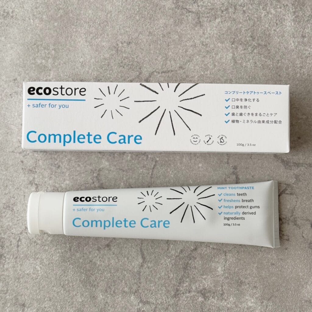 フッ化物・パラベン類・人工甘味料・SLS・合成香料・合成着色料不使用なecostoreの歯磨き粉。こちらは『コンプリートケアトゥースペースト』