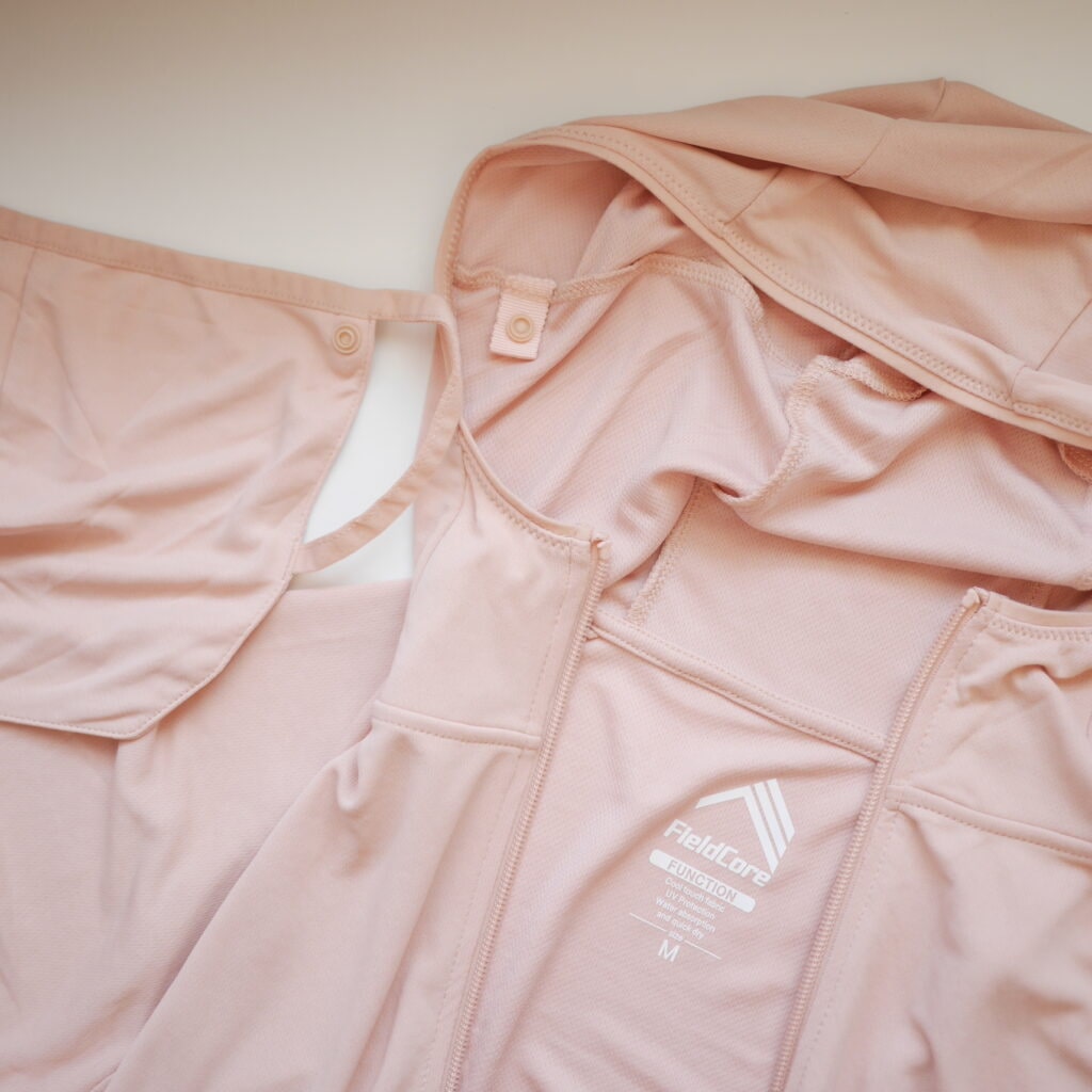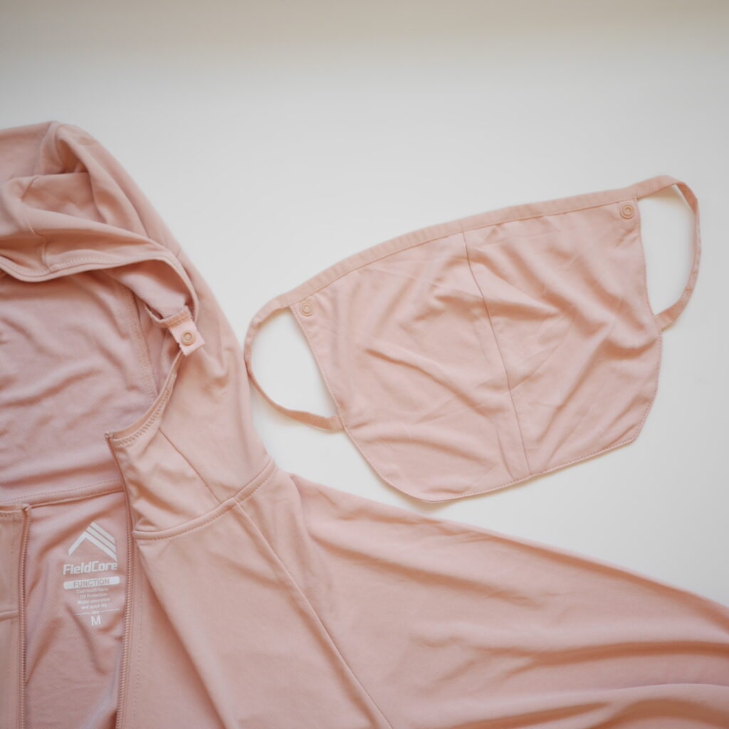 こちらのパーカーは薄手で、触った感じひんやりしています!そして、ボタンで取り外し可能なフェイスガード付きなんです。