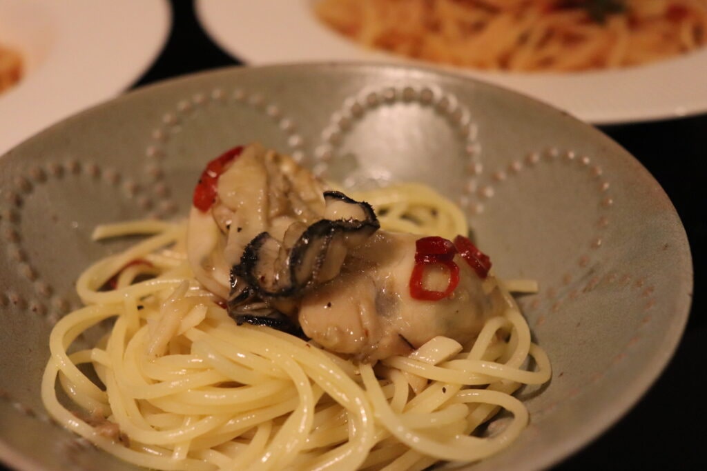 お酒のあてとして牡蠣のアヒージョを作ったのですが、パスタも食べたいー!