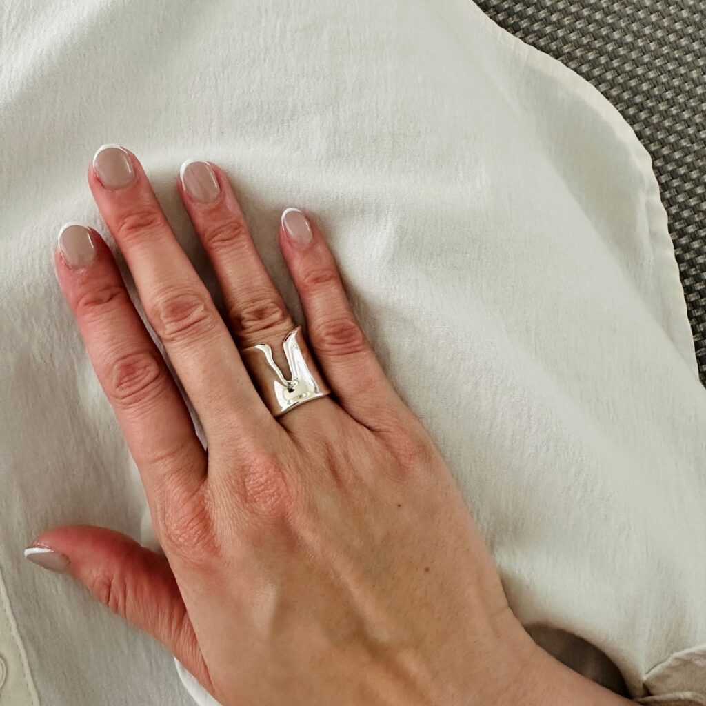 かなり太いリングなのでサイズをあげた方がいいのかな?と思っていたのですが、通常通りのサイズで問題ありませんでした。