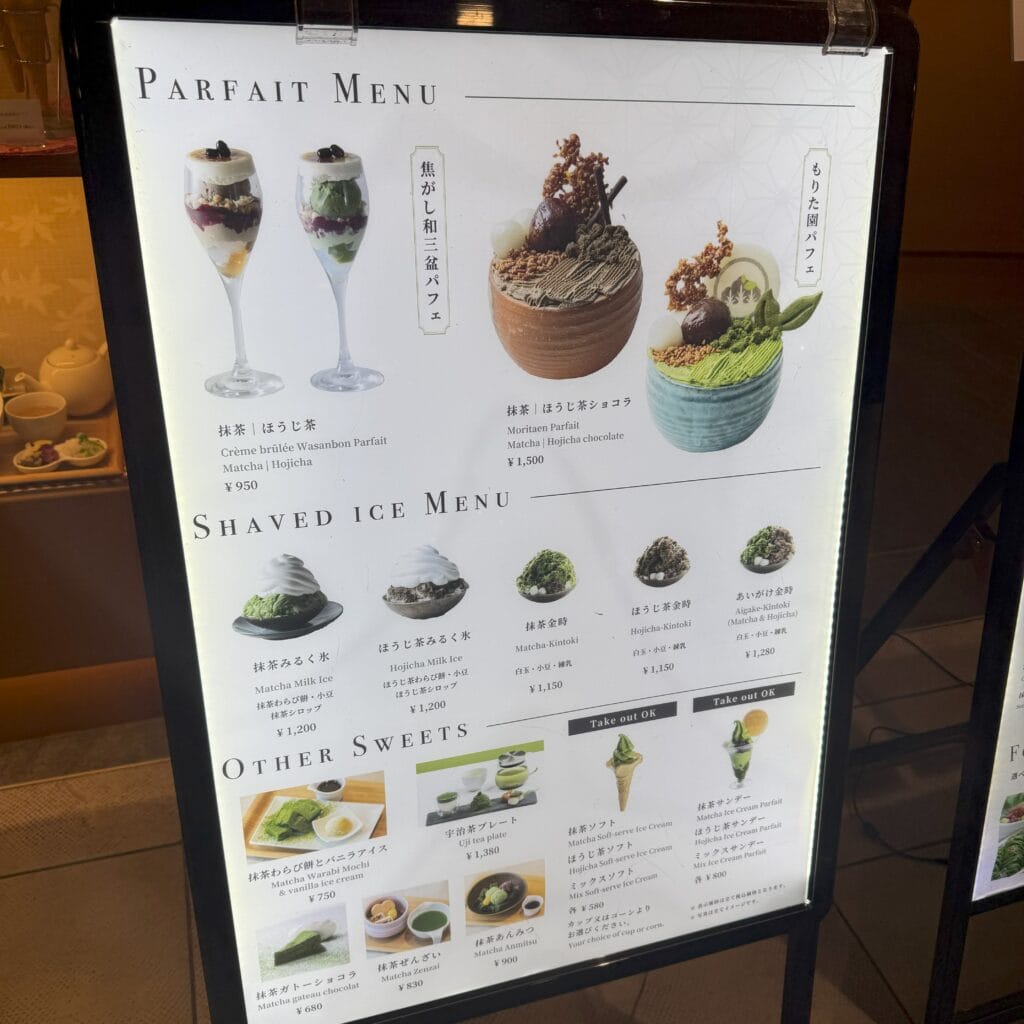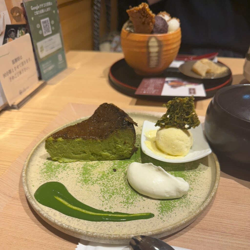 私は抹茶のチーズケーキ、奥に見えているのがまこみーちゃんが頼んだ「もりた園パフェ