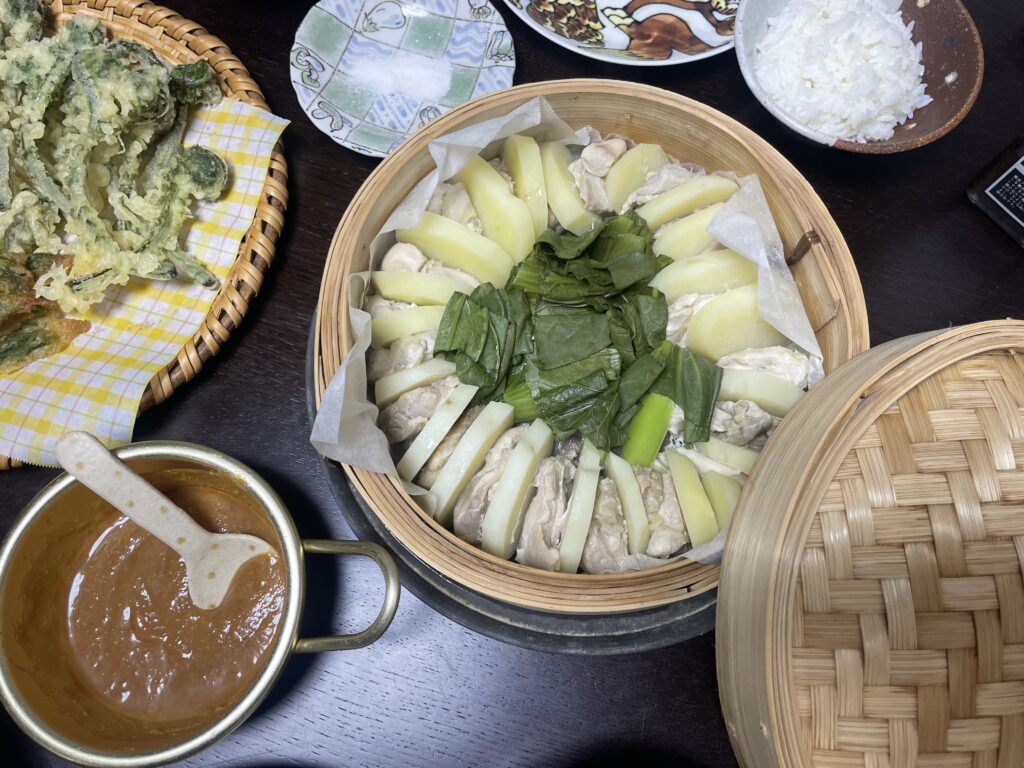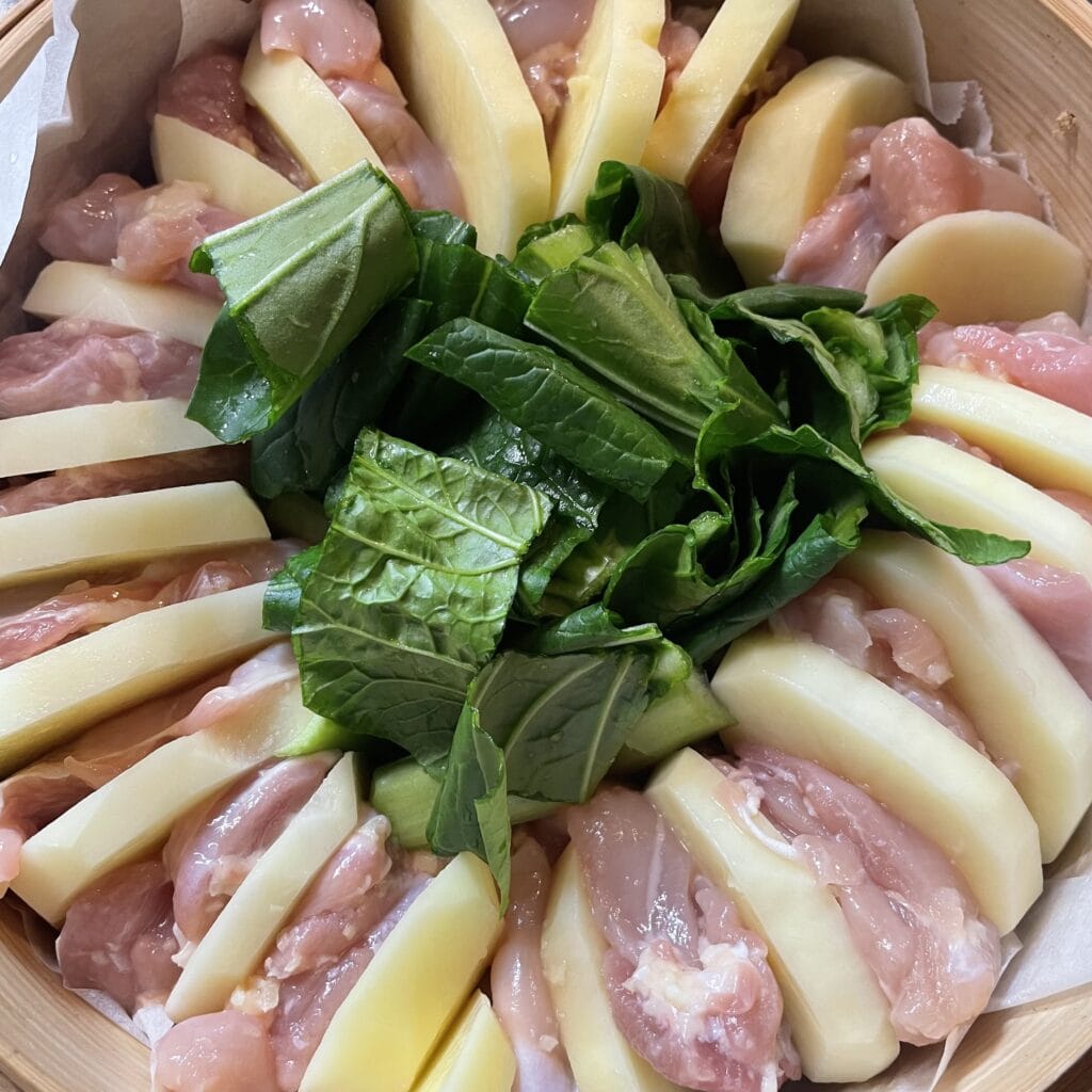 じゃがいももホクホク、鶏ももはジューシーに蒸し上がりました!ソースが子ども達に大ウケでした。竹材蒸籠(大・直径23cm)使用。