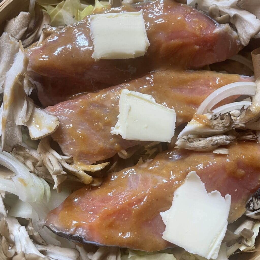 バターの香りがふんわり香って、サケもフライパンで焼くよりジューシーに!竹材蒸籠(大・直径23cm)使用。