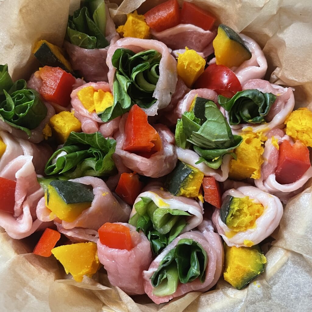 安くなっていた豚肉の切り落とし肉で、こちらを!レシピ本来の巻く野菜はカブ・黄色のパプリカ・菜の花ですが…、私は小松菜・かぼちゃ(加熱済みを冷凍してあるもの)・赤パプリカを巻いてみました。