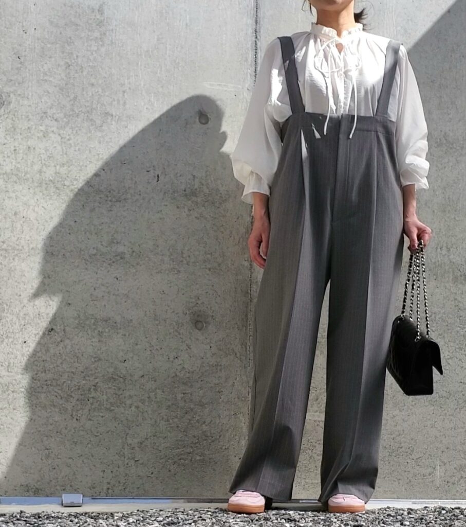 ちなみに、ご紹介しているサスペンダーサロペットはグレー系とネイビー系の2色展開です。私はカジュアルに着たくてグレー系を選びましたが、ネイビー系だとよりきちんと感が出て、オフィスやオケージョンにも対応してくれそうです。