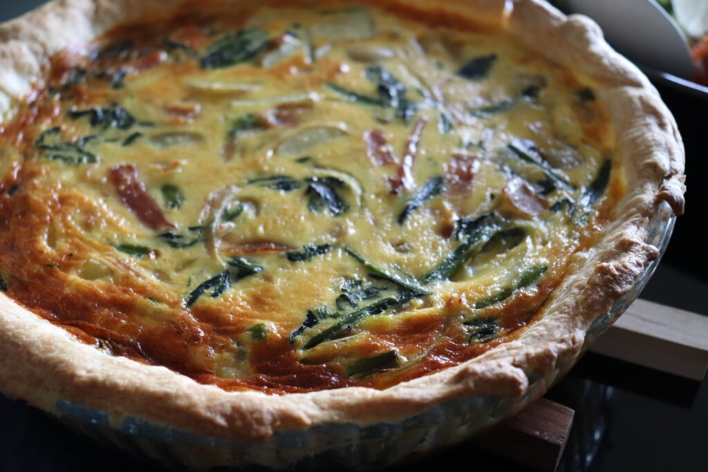 玉ねぎ、ベーコン、ほうれん草、ジャガイモを炒め、粉チーズと生クリームの入った卵液と合わせるだけ。パイシートは市販のものを使いました。