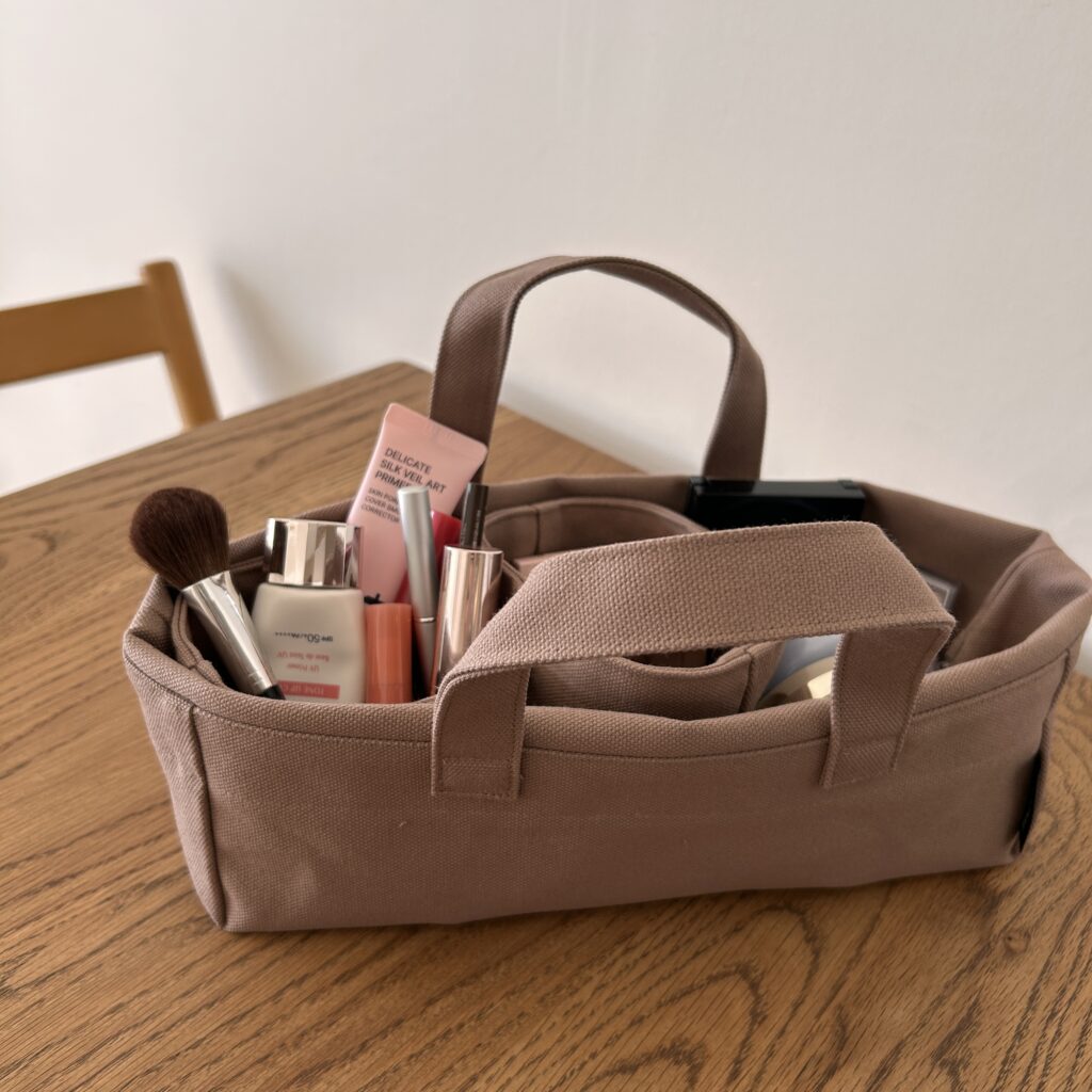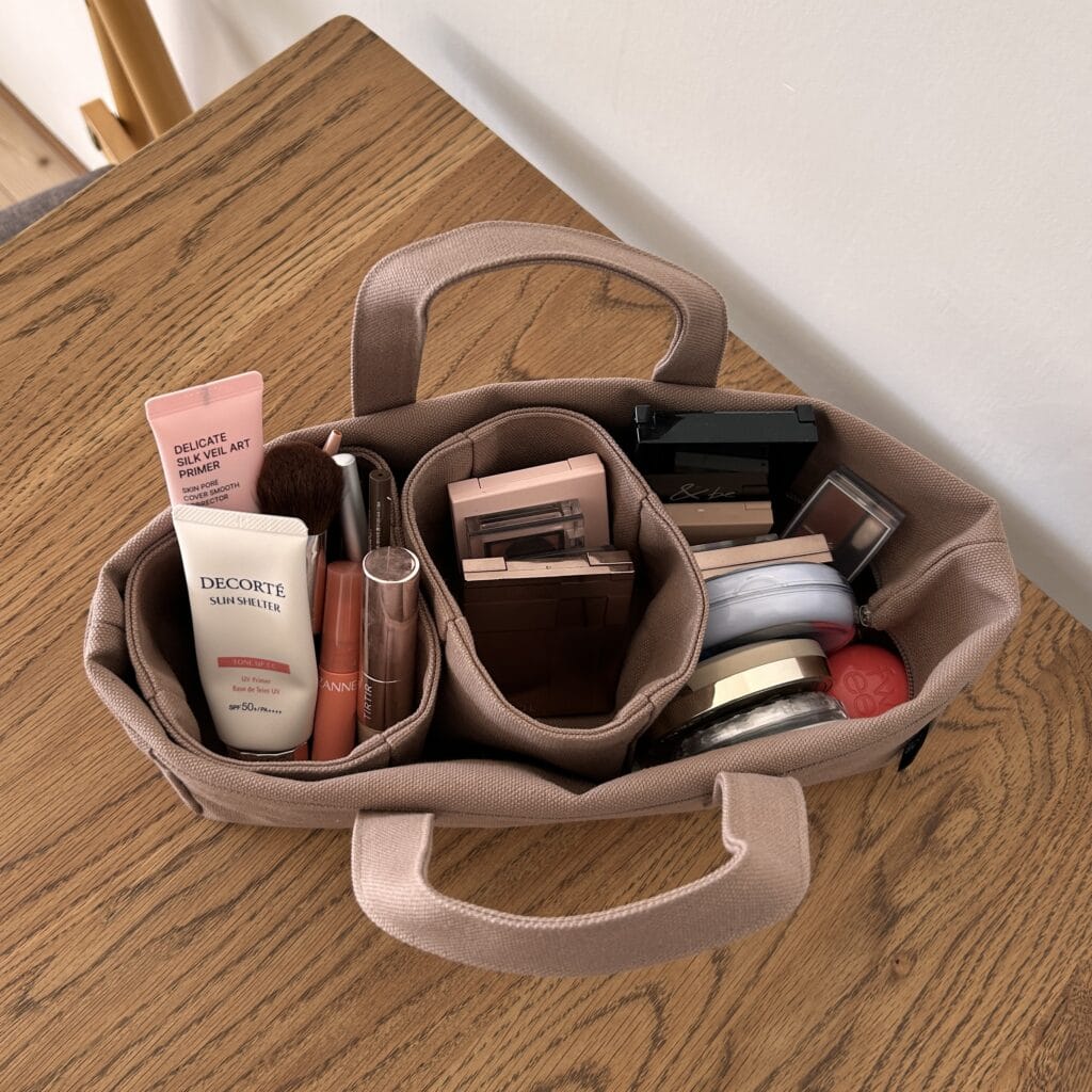 左のスタンドポーチにマスカラやリップ、下地など長さがあるものを収納。
