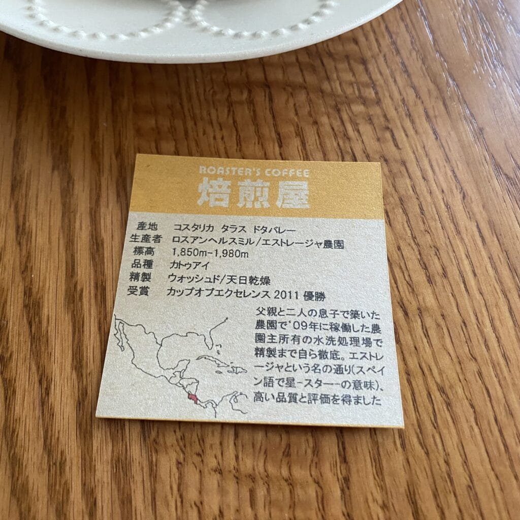 コスタリカの中深煎りを選びました。少し粗めに挽いて、お湯は沸騰させたあと、冷ましてから淹れるのがオススメとのこと!