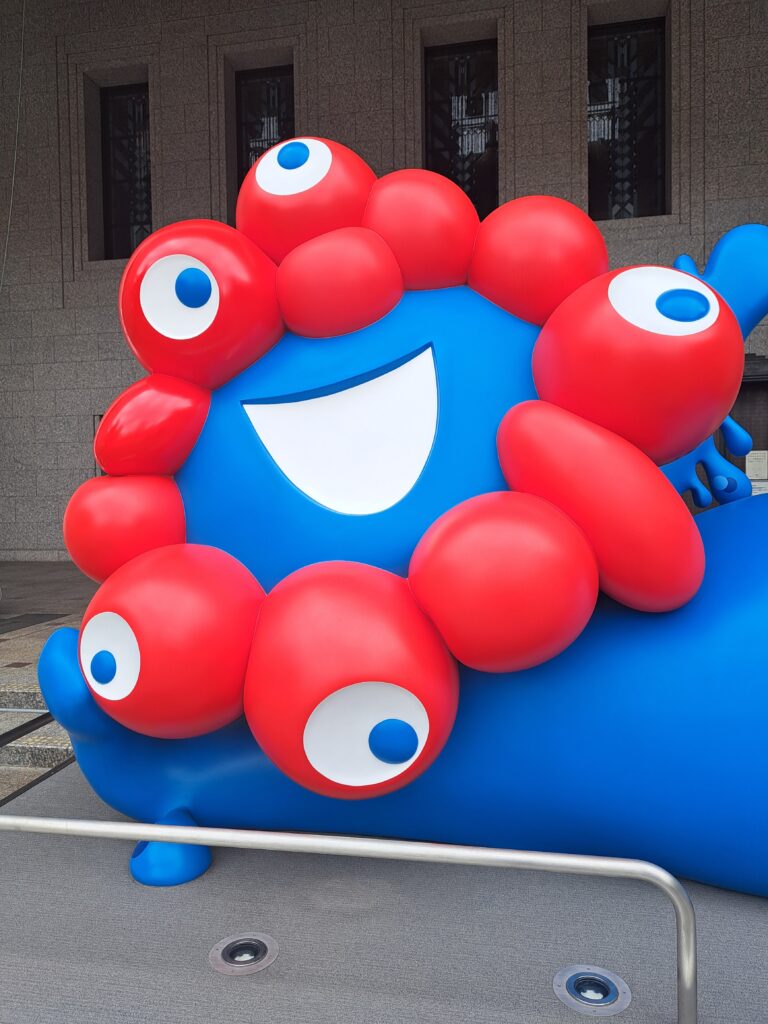 「モーニングの時間なら会えるよー!」と言ってくださった先輩と、北浜から中之島の中央公会堂の横を通り淀屋橋まで歩いて出たら、突如視界の右側に入ってくる、巨大なミャクミャク。