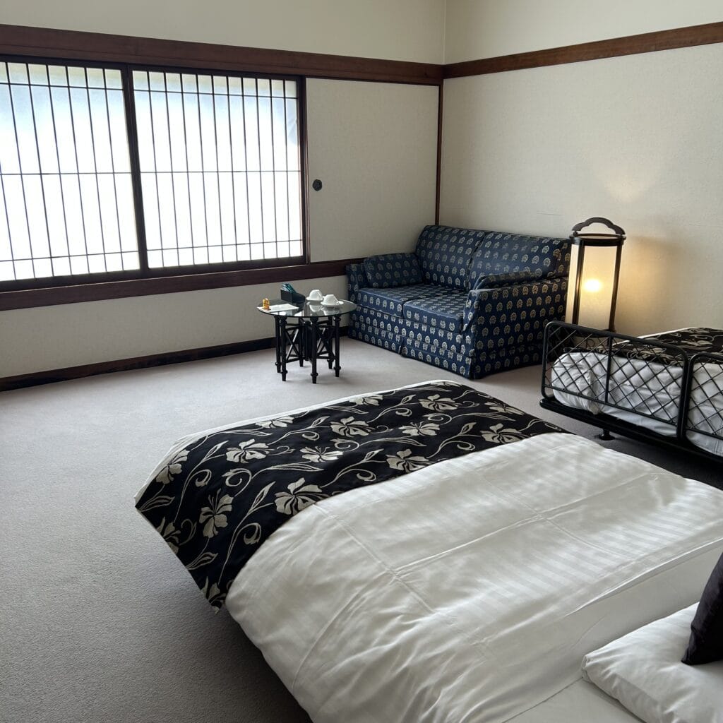 お部屋はスーペリアツインです。和モダンな感じでとても素敵💓すごく落ち着きます。予約時に子供がいることを伝えていたところ、ベットガードをつけてくださってました。奥にあるオシャレなソファー、私一回も座れてない!こだみがぬいぐるみを大事に並べてました…。