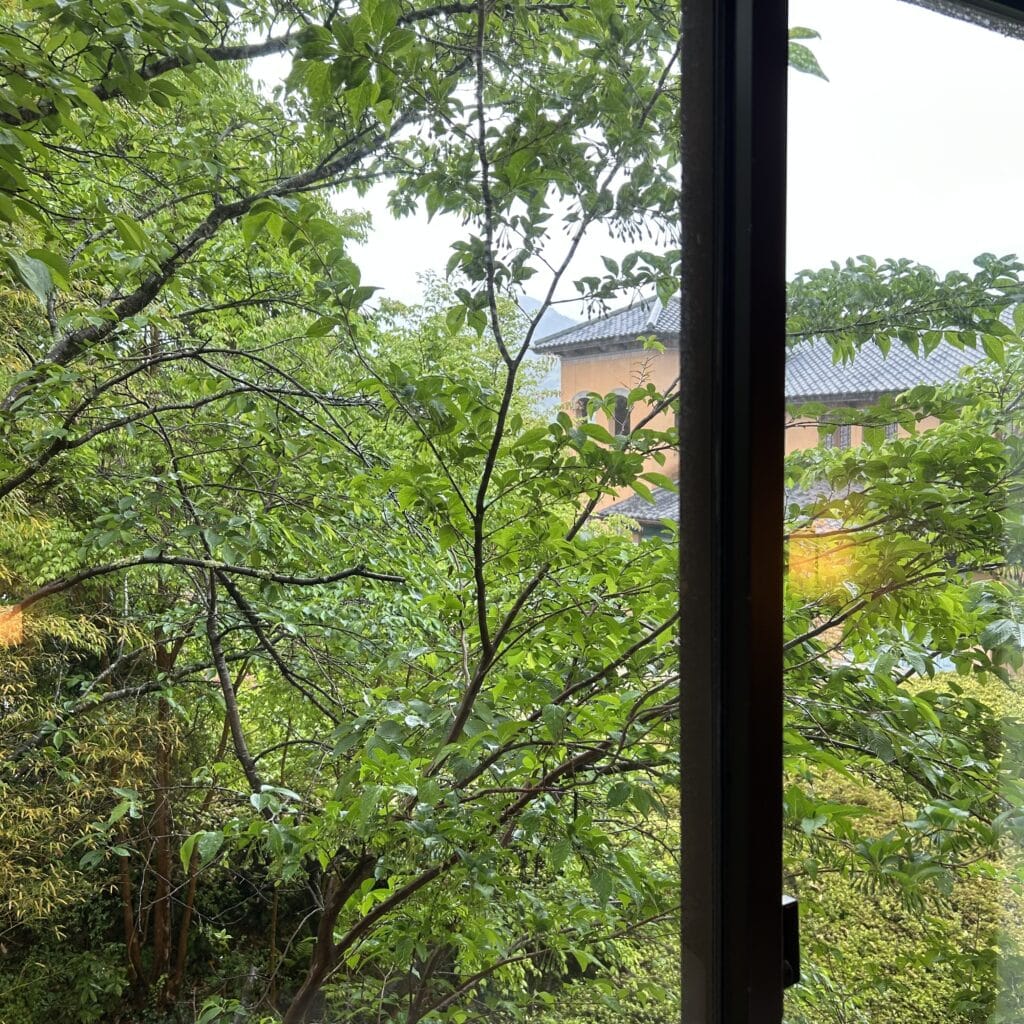 朝、客室からの景色。雨でしたが、新緑が綺麗なこと!