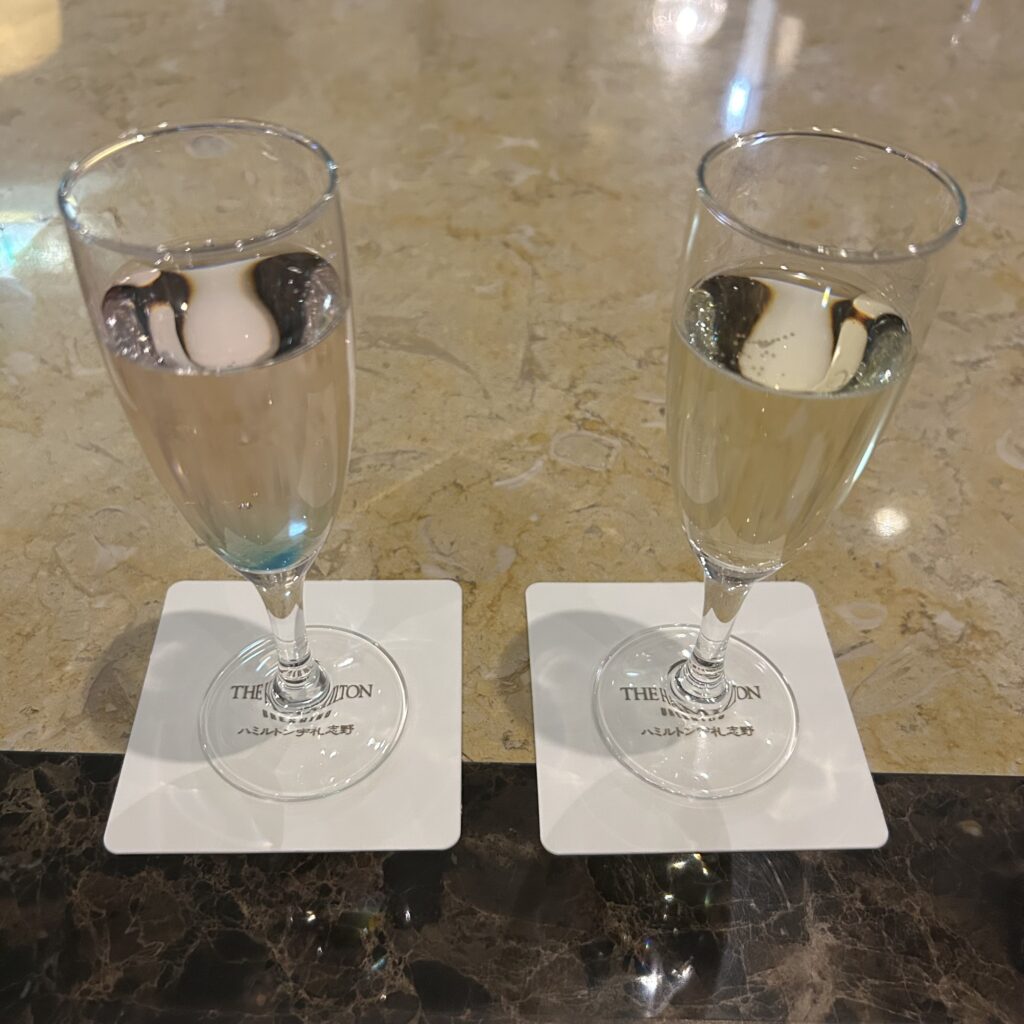 左はバラのエキスを炭酸水で割ったもの、右はスパークリングワインです。間違っても、一気飲みして、プハー!なんて言っちゃダメです(私です)。こだみ(もうすぐ5歳女児)にはリンゴジュース。お嬢さん、一気飲みしてました…。
