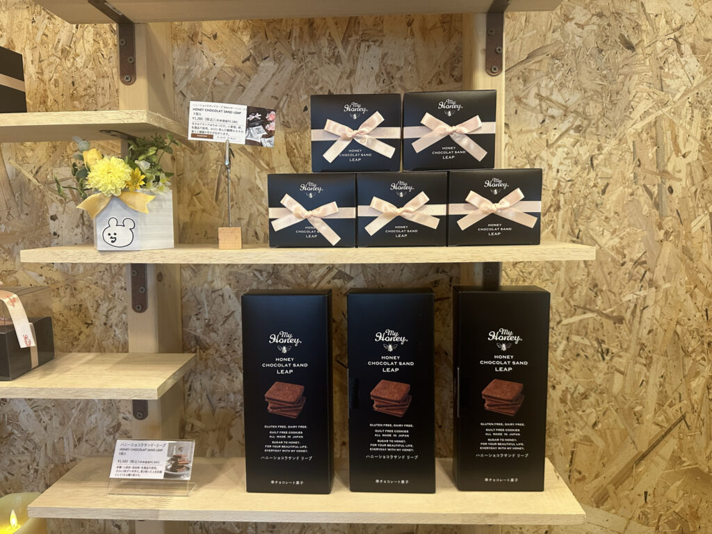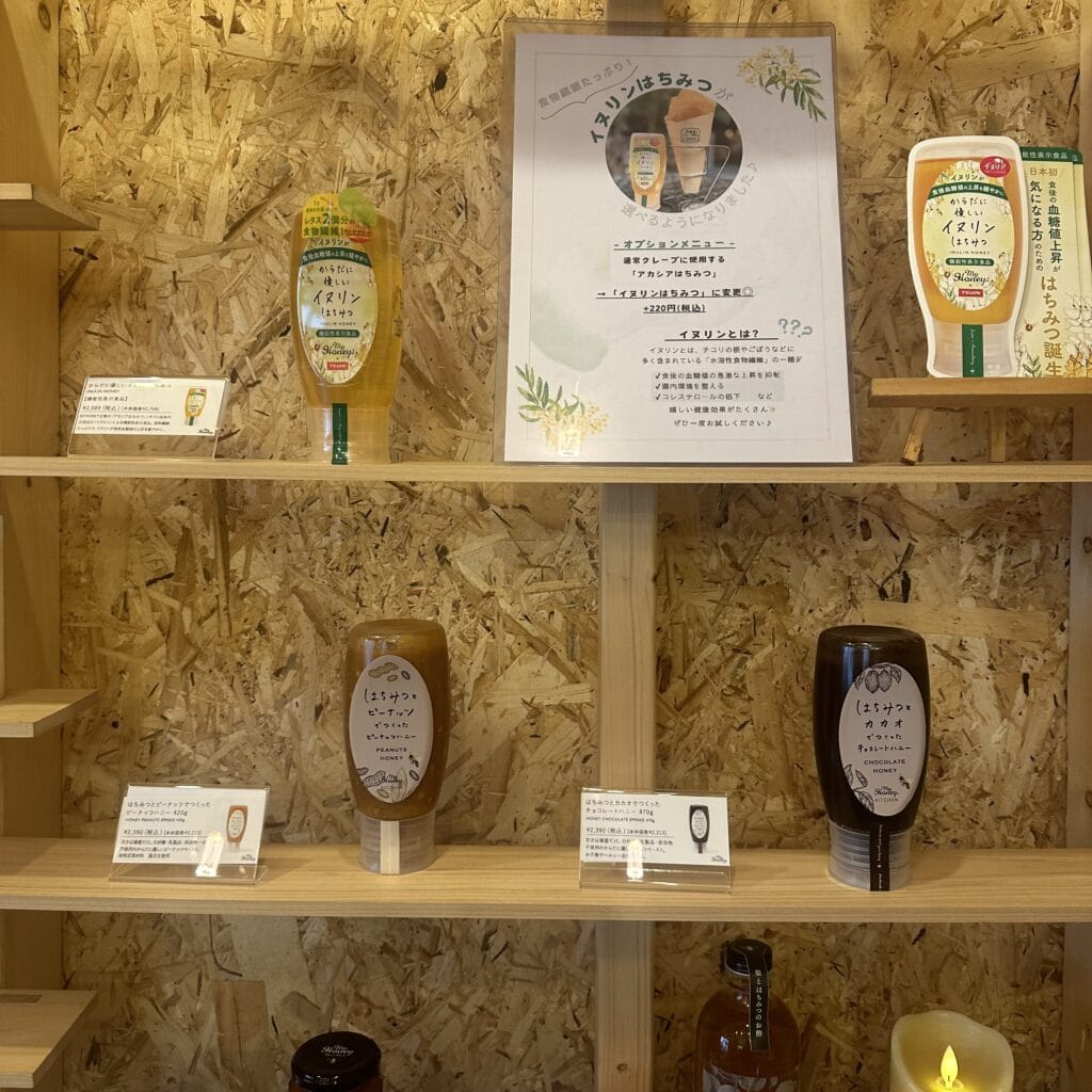 店内には、クレープのトッピングにもできる「ハニーショコラサンド」や、はちみつも各種販売されていました。