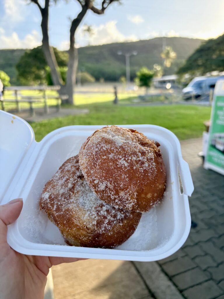 旅の中でお店に行くチャンスが無いかもしれないと思った私は、あらかじめマラサダ付きのツアーを予約。ダイヤモンドヘッドで朝日からパワーをもらい、頂上から降りてきて外のベンチでもぐもぐ。