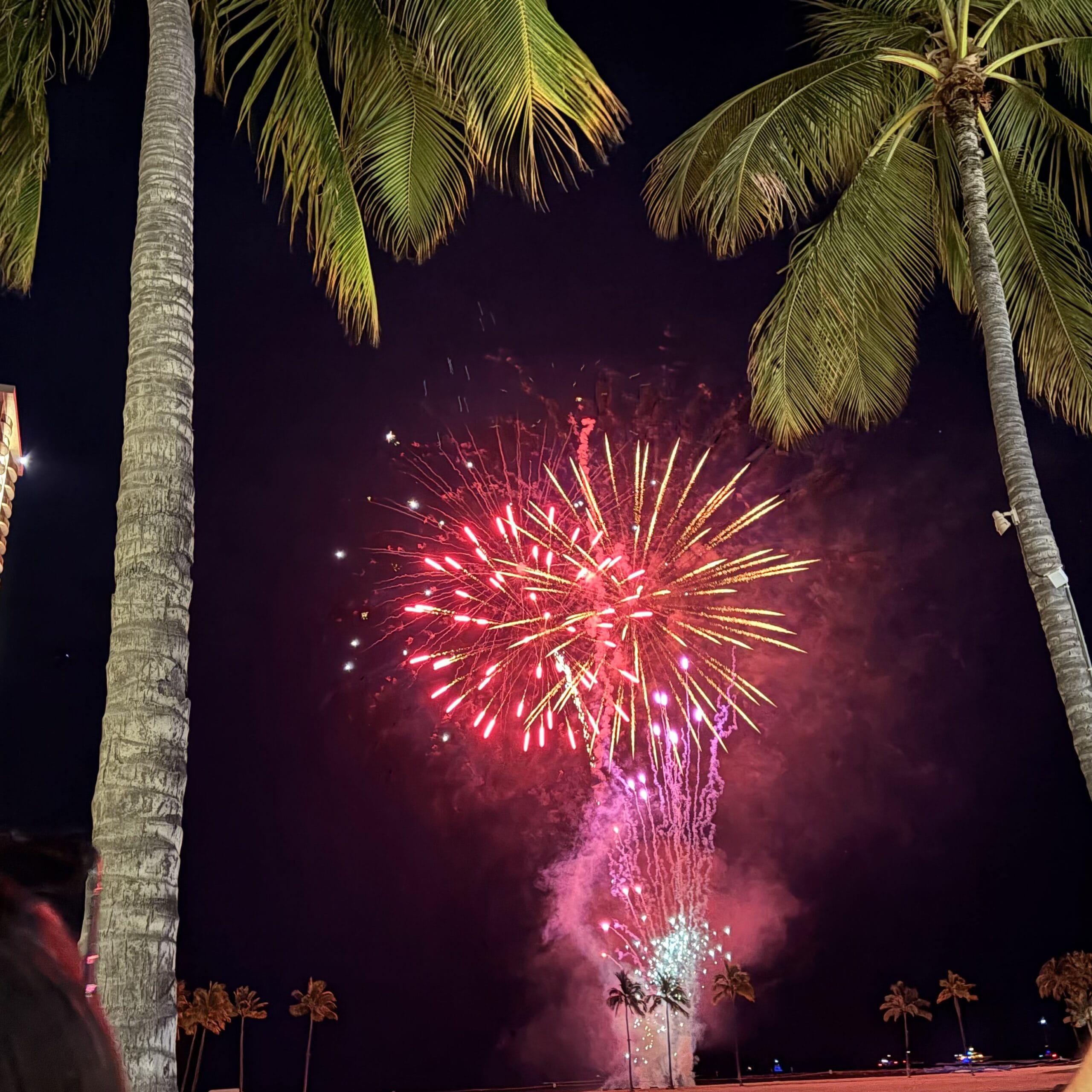 今回は土曜お昼のフライトで帰国したので、金曜夜はちょうどこの旅のラストナイト。旅のしめくくり、というにはまだ半日あるので少し早いですが、ヤシの木の隙間からみるビーチの花火はハワイらしさ満点で、とても良い思い出に。