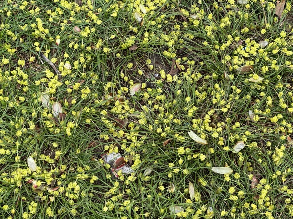 何かの花粉? いえいえ正体は小さなチューリップのような形をしたお花でした。