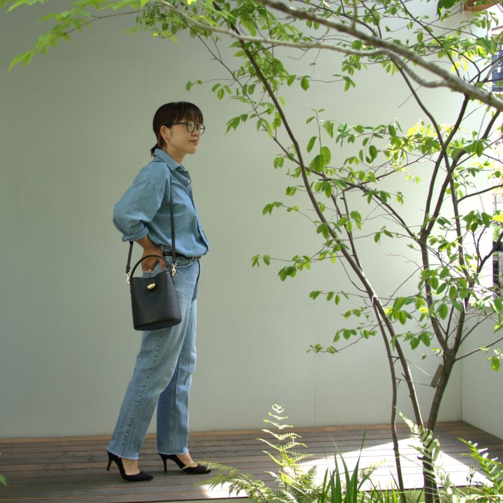 Egg Backetに黒いヒール、黒縁メガネを合わせればちょっと大人なカジュアルに。