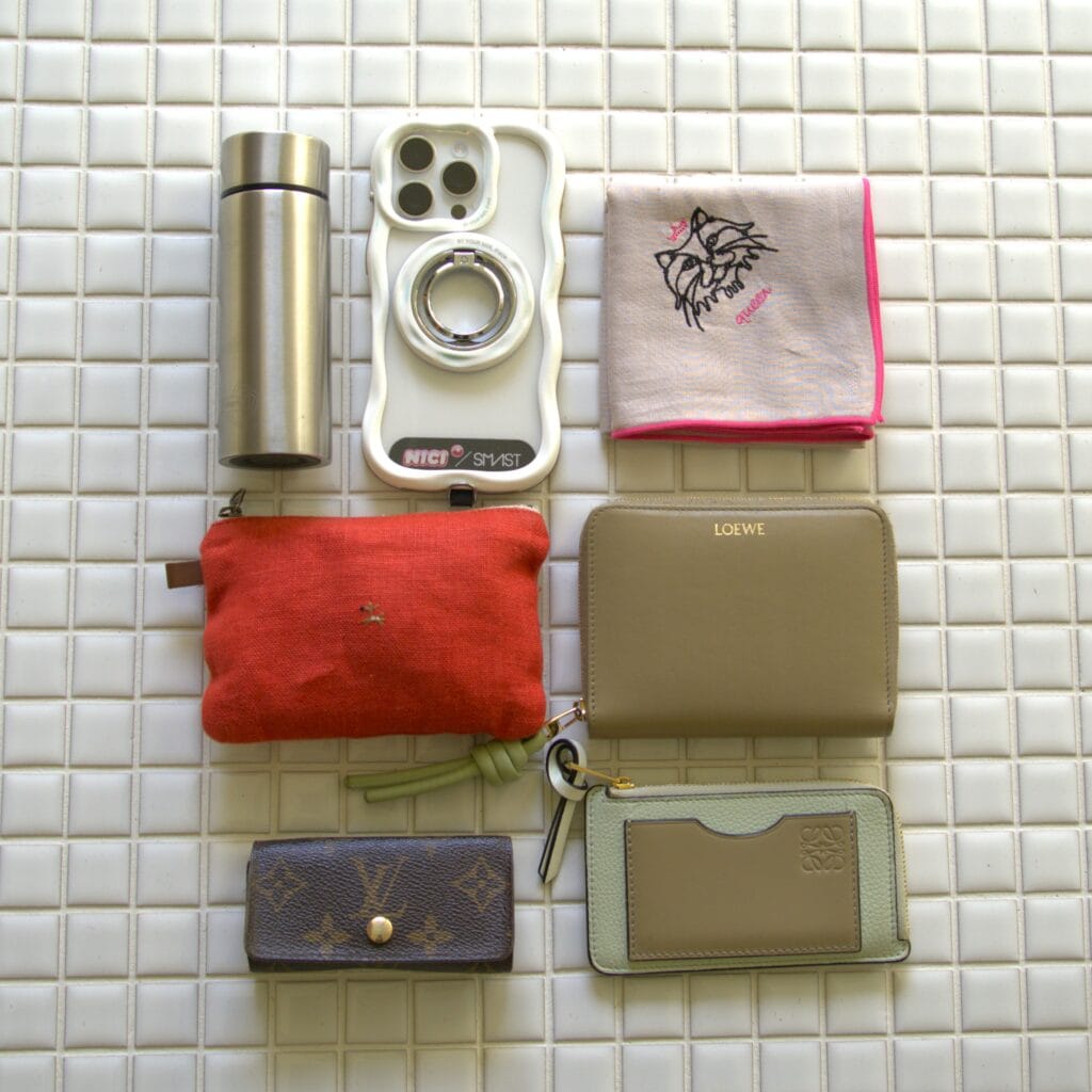 ついつい長いストラップがついていると斜め掛けしたくなりますが、大人はこういう肩掛けが