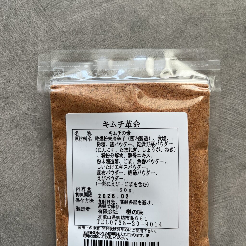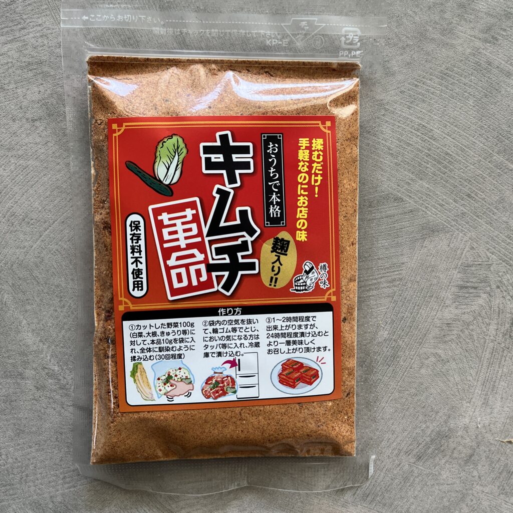 乾燥粉末唐辛子、麹パウダー、旨み成分などが入ったキムチの素で、カットした野菜に揉み込むだけキムチが出来上がるというもの。