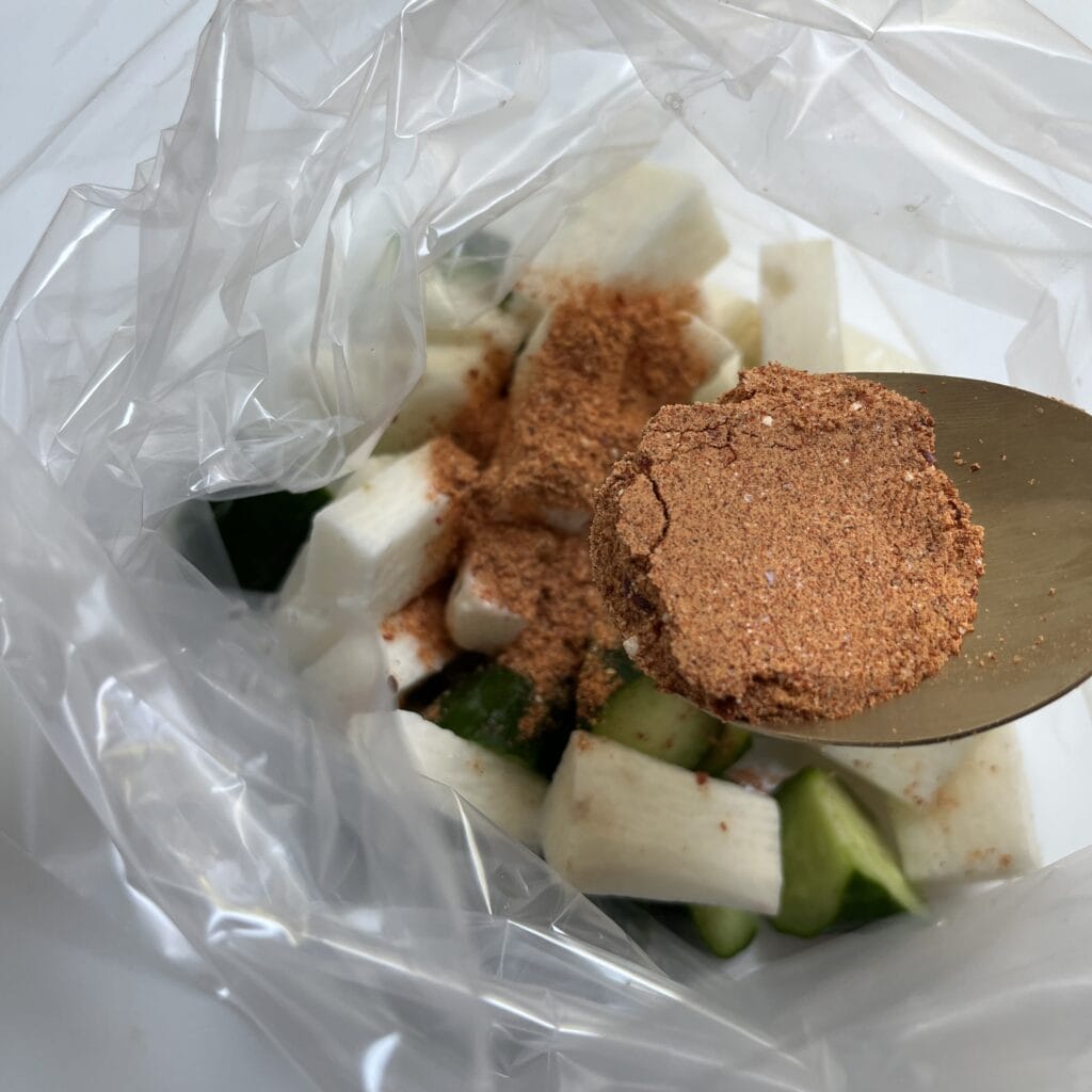 きゅうりはカットして、長芋と一緒にポリ袋に入れてキムチ革命と一緒に揉み込みます。