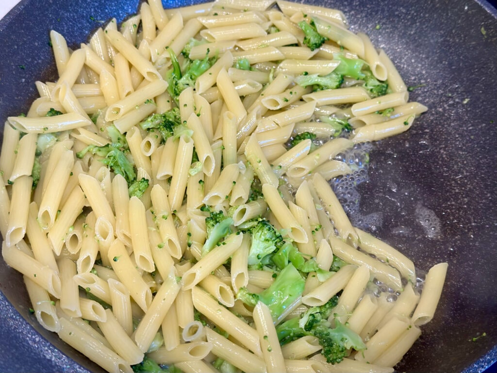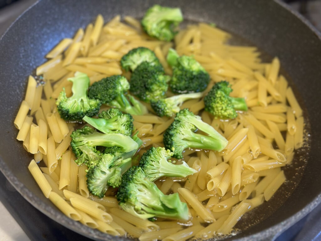 小房に分けたブロッコリーとペンネ、お水やコンソメなどの調味料を全てフライパンに入れて茹でるだけ!