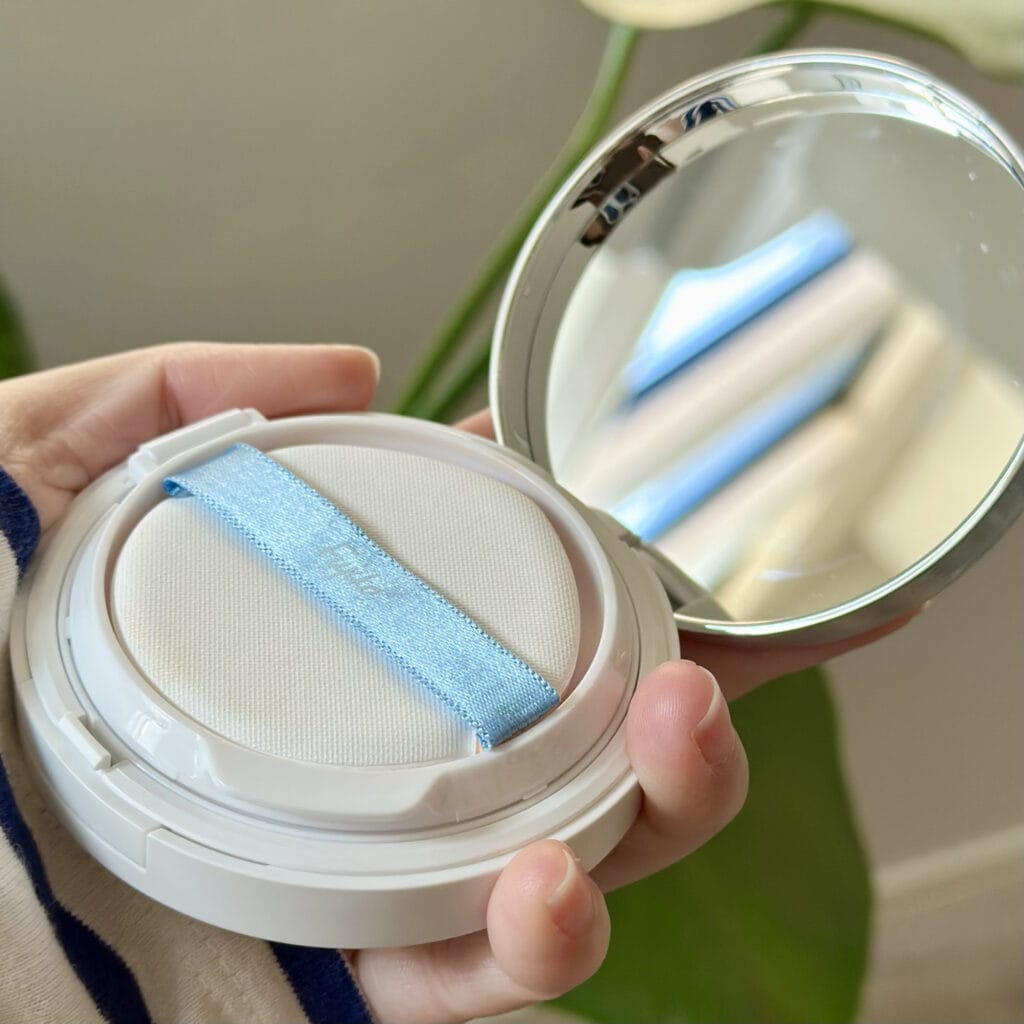 中を開けるとミラー&パフ付き。パフは丸ではなく少し先が尖った形をしているので、小鼻の周りなどの細かい部分もピンポイントで塗りやすかったです。