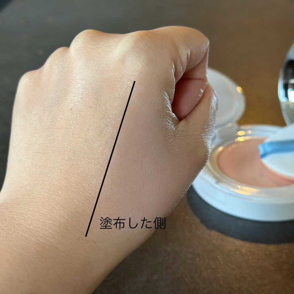 カラーはピンクベージュです。ファンデーションのように色がしっかり付くというよりは、ふわっとしたヴェールで肌のアラを隠して均一にしてくれる感じでした。ほんのり血色感をプラスしてトーンアップしてくれます。
