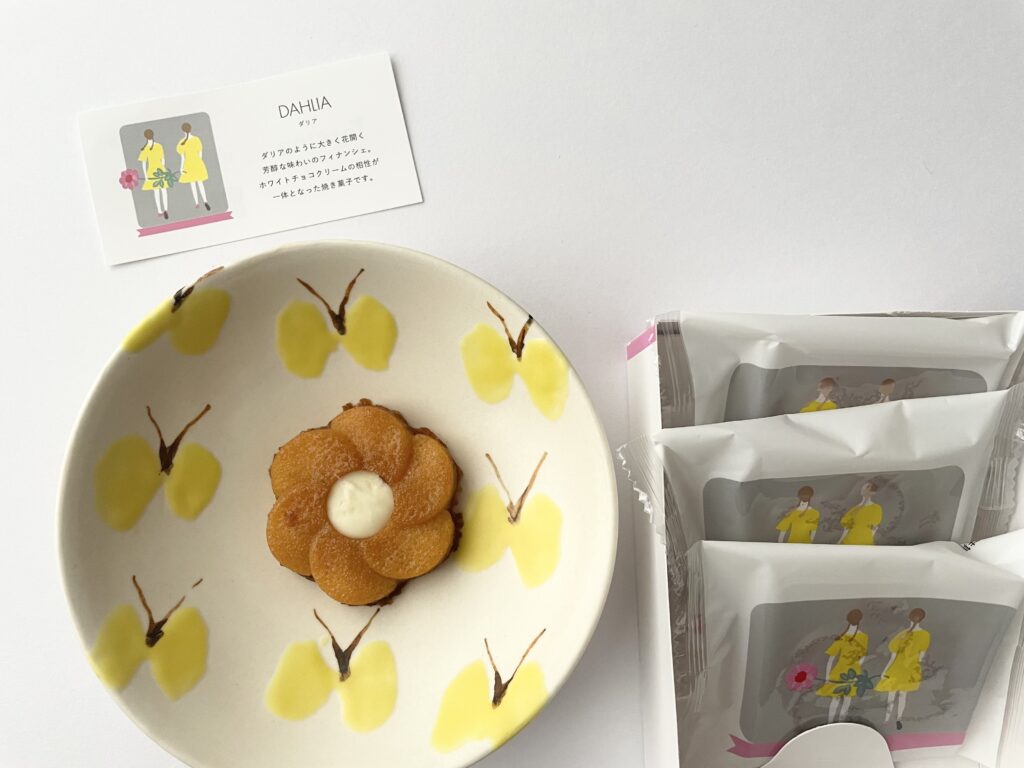 ↓こちらは「ダリア」。ダリアのようなお花の形のフィナンシェの真ん中にホワイトチョコクリームが絞られています。このホワイトチョコクリームがポイント!