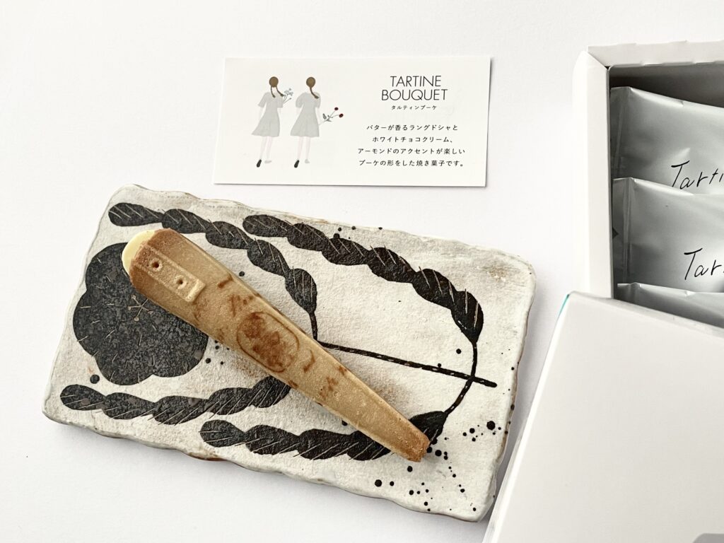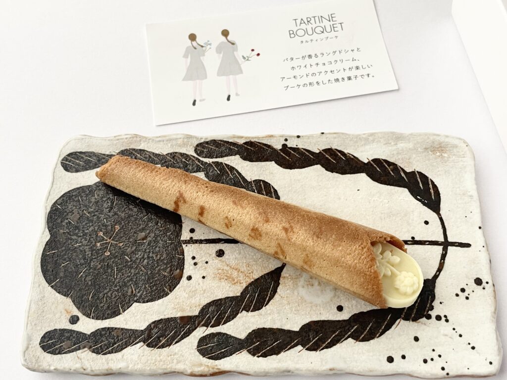 ↓こちらは新しくなった「タルティンブーケ」。側面に焼印も入って、さらに豪華なビジュアルに!お花モチーフのホワイトチョコレートが入口に被せてあります。