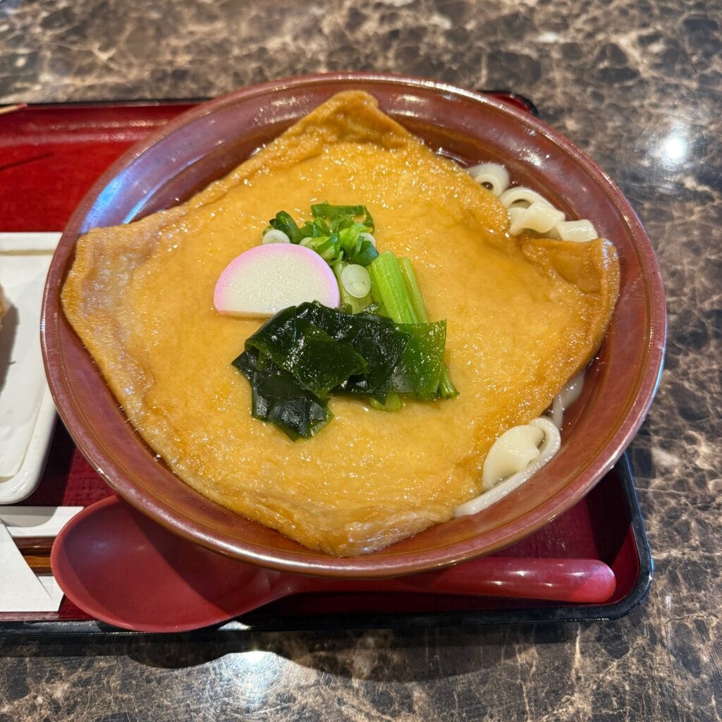 お食事を見て、大きなお揚げにびっくり!!きしめんが隠れるほどの大きさ!!きしめんはコシがあり、お出汁とお揚げの甘辛さがマッチしていてとっても美味しい〜