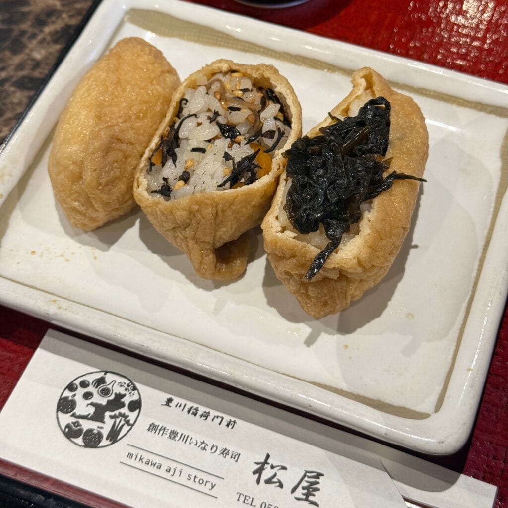 いなり寿司は、白いなりと五目、豊川わさびの3種。とても美味しくいただきました。いなり寿司のテイクアウトも人気があるようです。