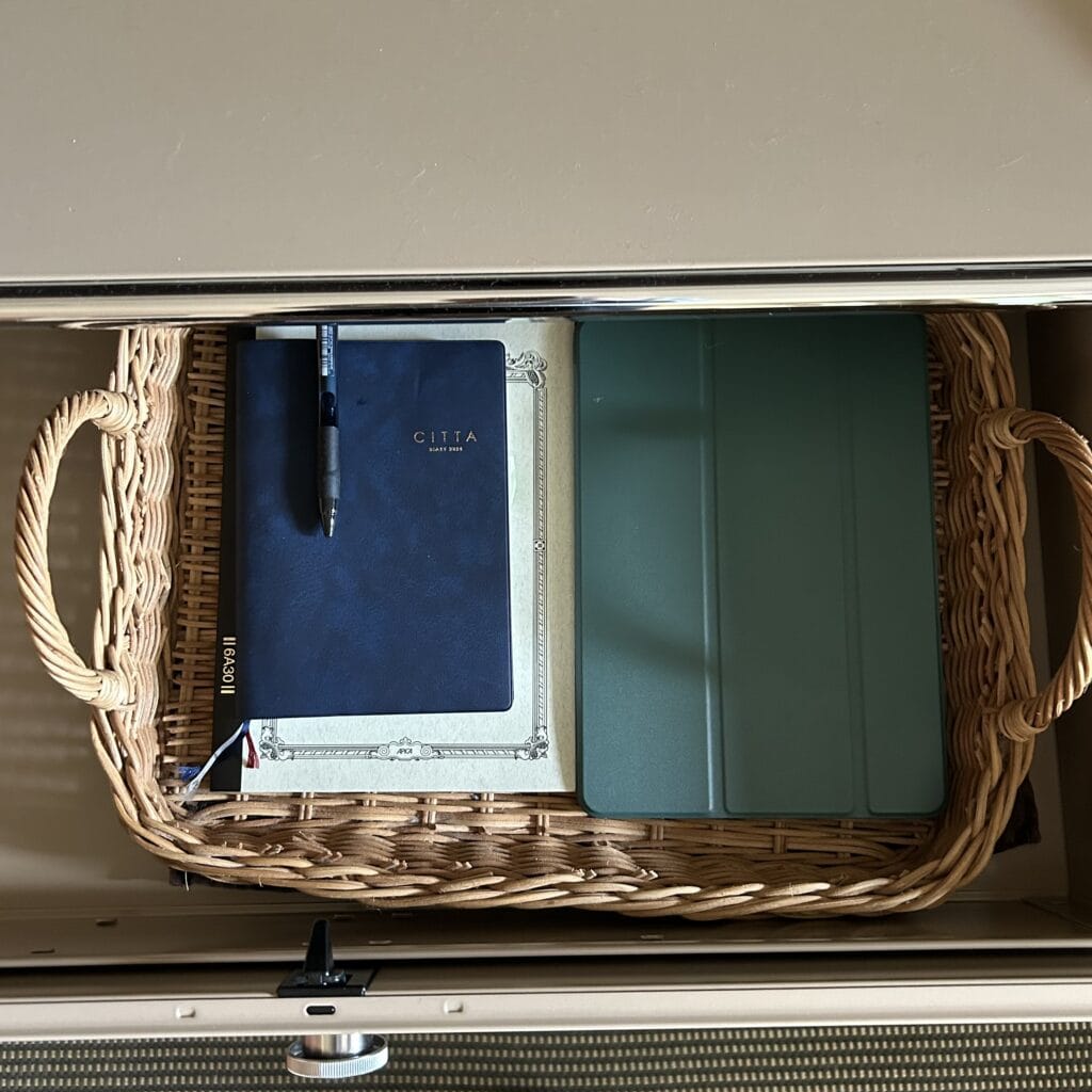 ここはまだ使い道が決まっておらず、とりあえずわたしがよく使うiPadや手帳などを。