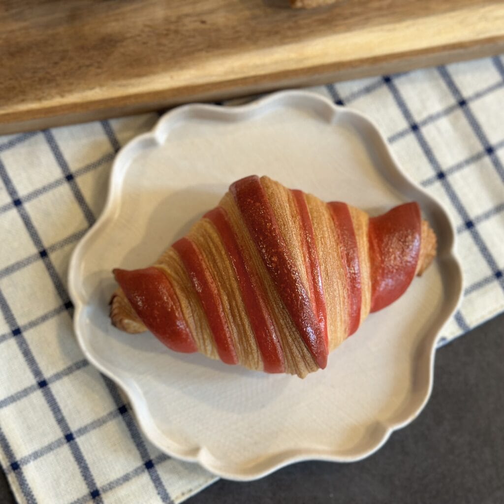●クロワッサン(フランボワーズ)・・アート作品のような美しいクロワッサン。中にはフランボワーズのチョコレートが入っていました。生地そのものが美味しかったので次回はプレーンを食べてみたい!バターの風味が強すぎず、あっさりとしています。シンプルな味わいでとても美味しいです!