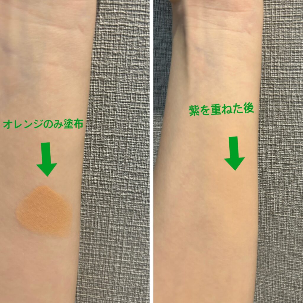 左のオレンジ(テクスチャー固めです)をクマやシミに指で広げます。その後に右のパープル(テクスチャーはサラッとしています)を重ねると…