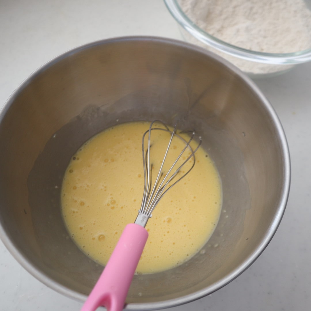 卵・油・ヨーグルトを泡立て器で混ぜて…。