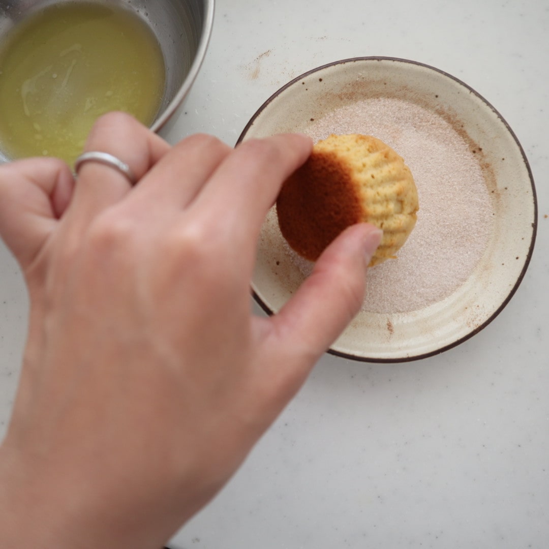 型から外して、バター(レシピはココナッツオイル)に上面だけ浸して、シナモンシュガーをまぶしたら出来上がり♪