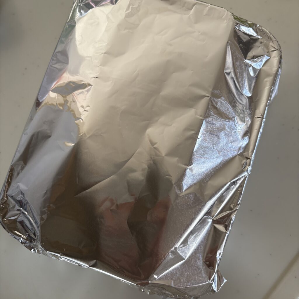 お湯を張ったバットの中に入れてアルミホイルをかけてオーブンへ。