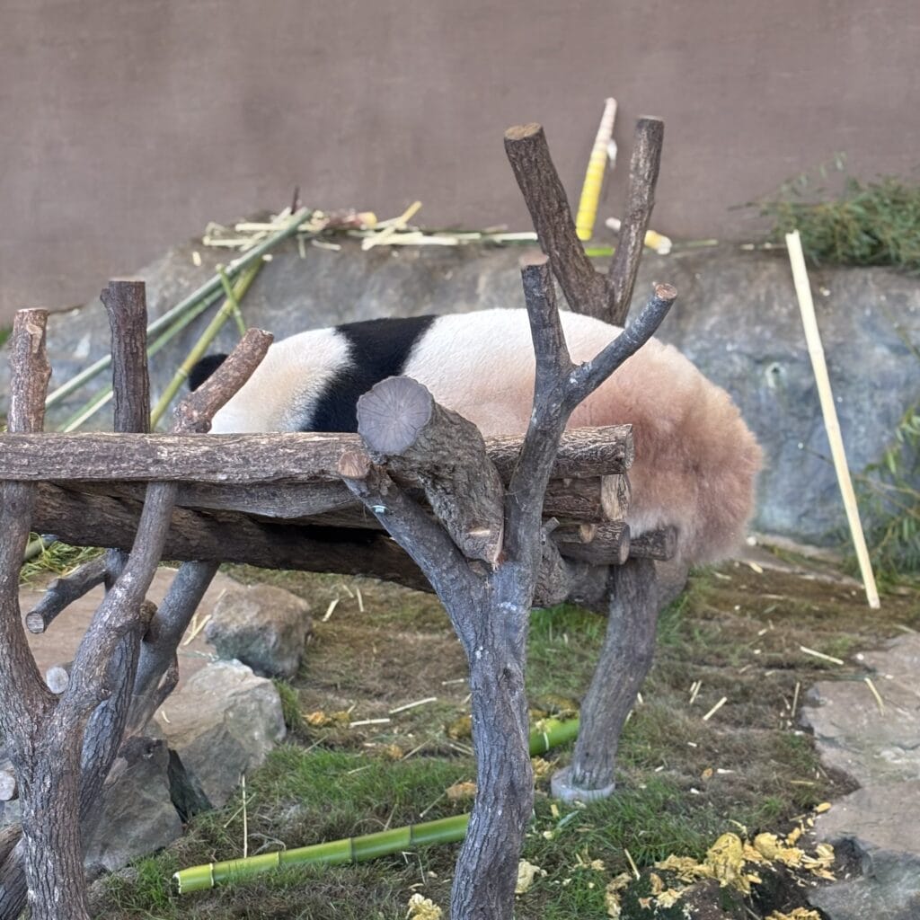 パンダラブの屋内には末っ子「楓浜(ふうひん)」4歳がいました。このパンダラブの屋内展示だけが、朝から夕方までずっと行列でした。ただ、40分待ちという表示が出ていても、実際は15分ほどで入ることができたので、時間表示はあんまり当てにならなさそうです。