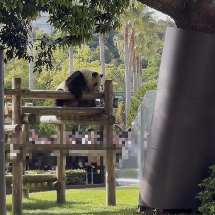 園内の奥にある「ブリーディングセンター」に向かいます。ここは2頭とも屋外展示なので行列はありません。混んでいる時間帯は一方通行で、空いている時間は行き来自由になっていました。ここでも数分ごとに飼育員さんが列交代の声かけをされているので、少し待てば最前列でパンダを見ることができます。