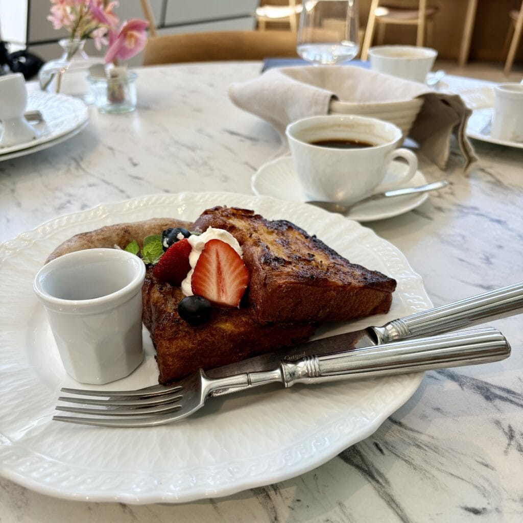 甘くて優しい味のフレンチトースト。家の朝ごはんではなかなか味わえない幸福感が口いっぱいに広がります。オーガニックソーセージもボリューム満点!