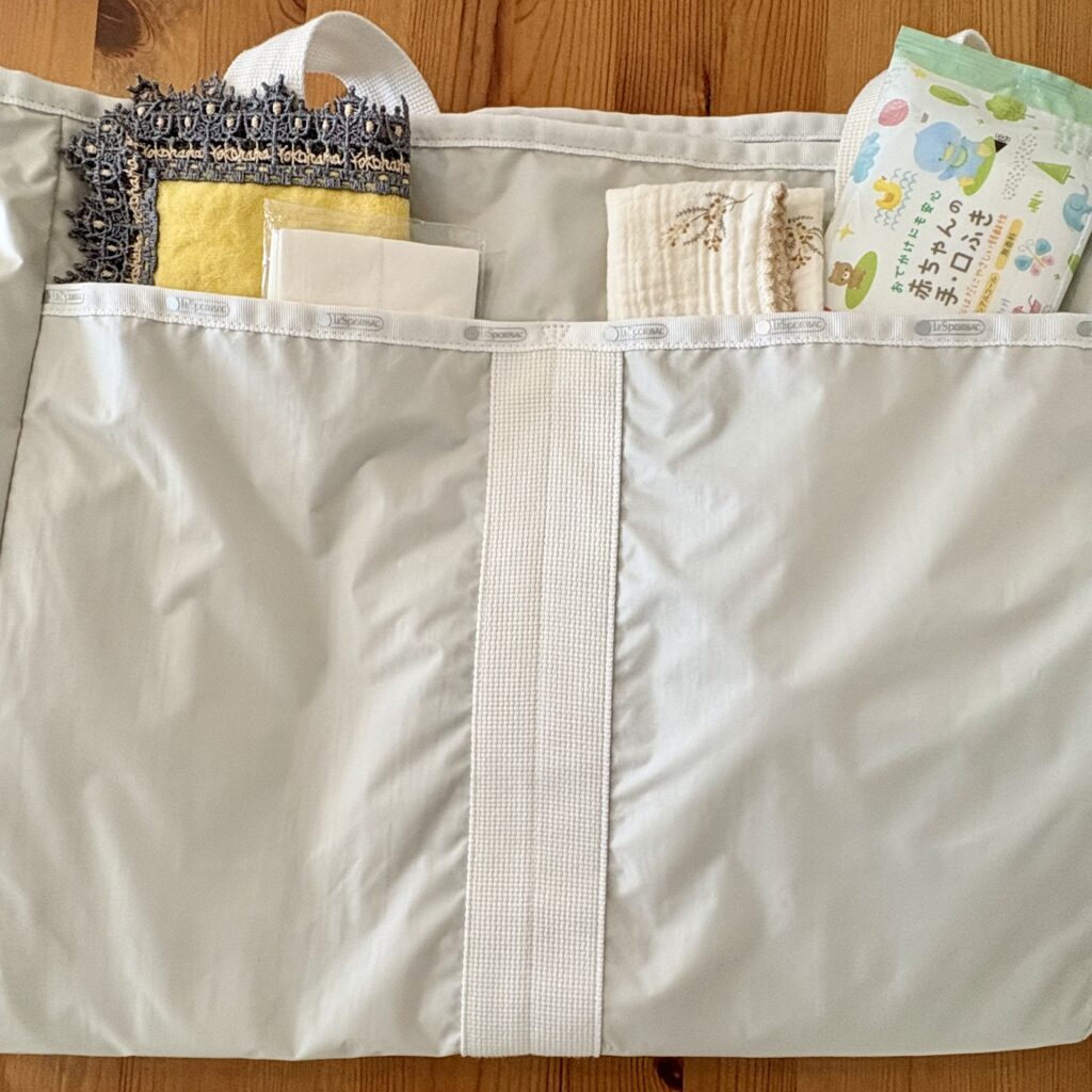 赤ちゃんとのおでかけはどうしても持ち物が増えてしまいますが、どんなに入れても元々のバッグが軽いのでそんなに重くならないのが嬉しい!
