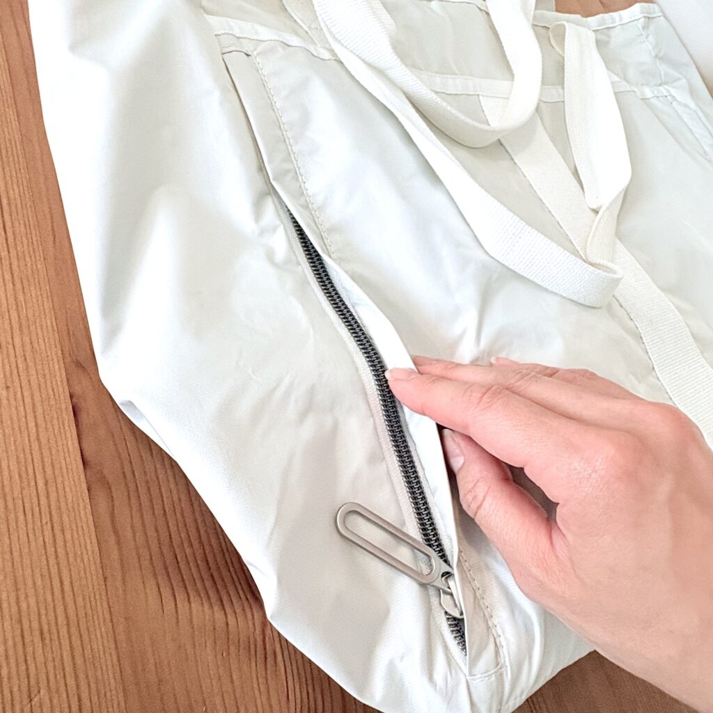 裏側のポケットは左右にファスナーがありますが、一つのポケットになっているのでどちらからも出し入れできます。ヨガマットなど長いものを持ち運ぶ時にも使えるようですが、折れ曲がったら困るものや、ちょっとした書類を収納しておくのにも便利。