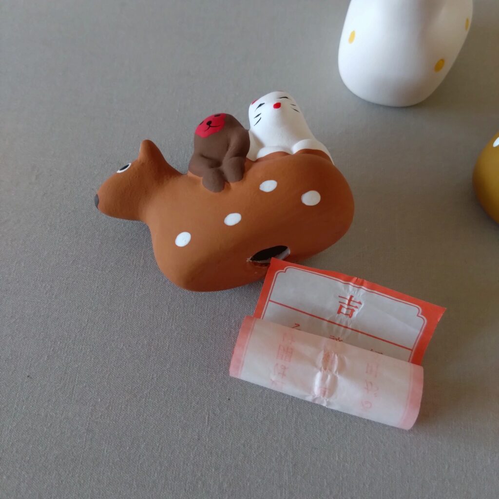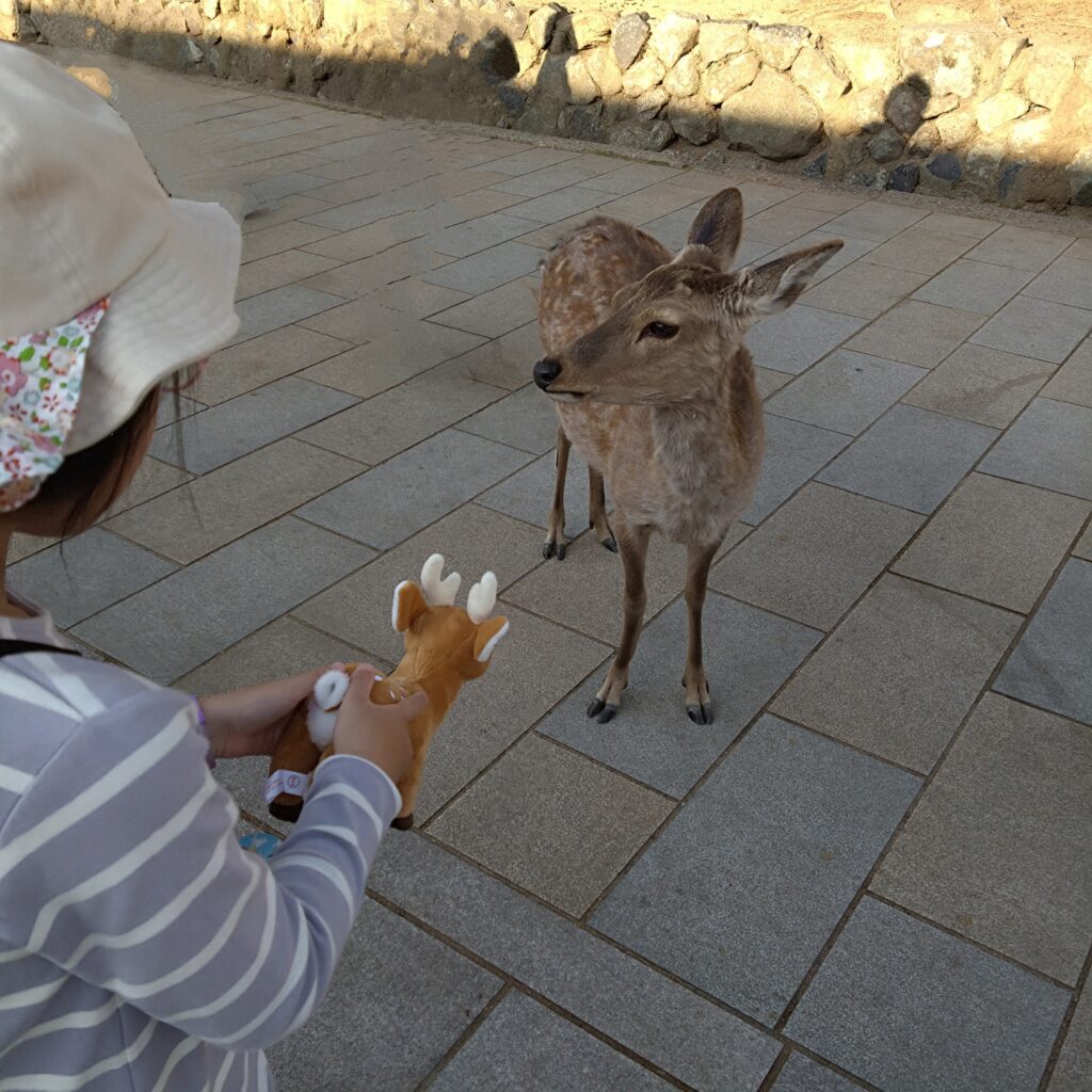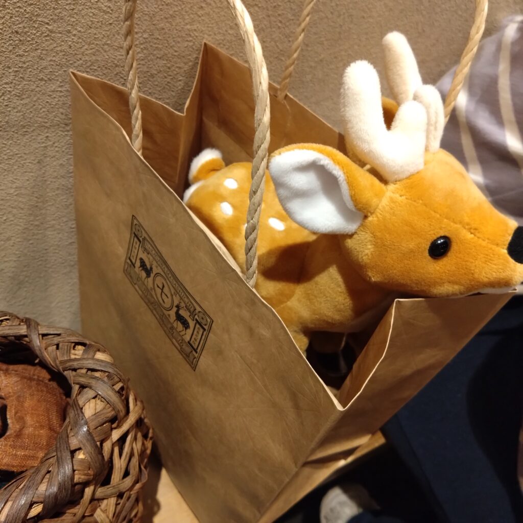 飛び出しているのはお土産屋さんで購入した、鹿のぬいぐるみ。